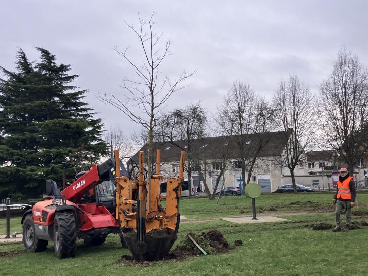 les racines afin de former une motte suffisamment stable pour supporter le déplacement. Le jour de l’intervention, des engins spécialisés ont été mobilisés pour extraire les arbres avec leur motte, parfois de plusieurs tonnes. Les arbres ont ensuite été transportés puis replantés sur des zones préparées à l’avance, avec une attention particulière portée à la profondeur de plantation, à l’orientation et à l’arrosage, essentiels à la reprise. Au total, 21 arbres existants ont été transplantés. Ils seront complétés par la plantation de 14 nouveaux arbres, d’essences variées, afin de renforcer durablement la trame végétale de la Plaine des Sports. Un suivi régulier est prévu pour accompagner la reprise et garantir la pérennité de l’ensemble des plantations.
