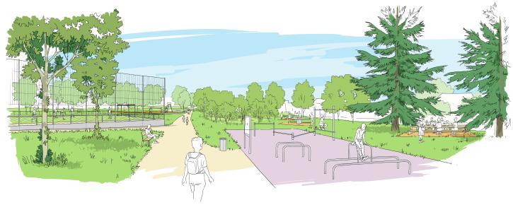 Un aménagement pour tous Située à proximité de l’école Ludovic-Piette, la Plaine des Sports a vocation à devenir un véritable espace de respiration pour le quartier. Pensé comme un poumon vert, ce nouvel sport et convivialité. Il préfigure l’ambition globale du projet ANRU : désenclaver Marcouville, améliorer la qualité de vie et redonner une image positive au quartier. L’aménagement prévoit le maintien de l’aire de jeux pour enfants, le transfert des agrès de street workout depuis les Hauts de Marcouville vers la Plaine des sports, ainsi que la création de nouveaux équipements sportifs accessibles à tous, dont un terrain de basket 3x3 et un terrain de football 5x5. Des tables de tennis de table, des espaces de pique-nique et des assises viendront compléter l’ensemble, favorisant les usages intergénérationnels et la rencontre.